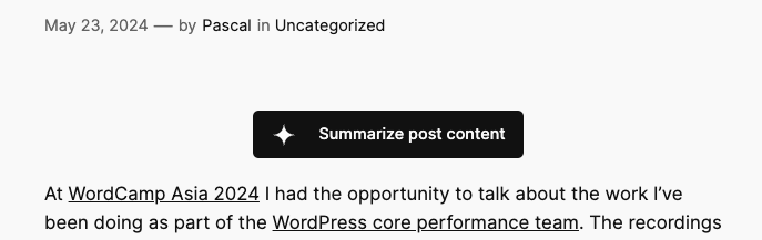 Uses Chrome’s built-in summarization API to provide readers a short summary of the post content. The UI is powered by WordPress’ new Interactivity API.